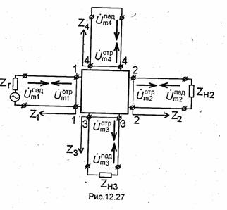 Введем в каждой линии передачи (см. рис. 12.26) соответствующую систему координат так, чтобы продольная ось была направлена от сочленения, а ее начало было расположено в плоскости отсчета фаз рассматриваемой линии. При этом начало