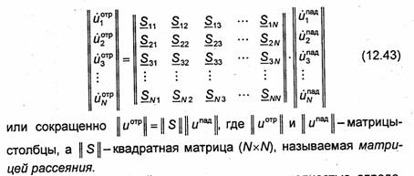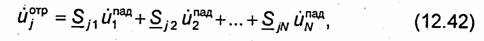 Если рассматриваемое N-плечное устройство является пассивным и линейным (содержит лишь линейные среды), то в силу линейности уравнений Максвелла нормированное напряжение отраженной волны uj°тр в плоскости отсчета j-го плеча (на полюсах j-j многополюсника) можно рассматривать как суперпозицию волн, образовавшихся под воздействием падающих волн в плоскостях отсчета всех плеч устройства (на всех полюсах многополюсника при n = N):