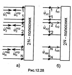отсчета продольных осей Z1Z2.....ZN в эквивалентной схеме (рис.12.27) совмещено с соответствующими полюсами 1-1,2-2, ...,N-N. Будем называть волны, распространяющиеся в плечах в сторону многополюсника, падающими, а волны, распространяющиеся от многополюсника,-отраженными. Пусть генератор создает в линии 1, подключенной к плечу 1 многополюсника, падающую волну напряжения..Эта волна, дойдя до сочленения, будет частично отражаться, вызывая в линии 1 отраженную волну, а частично, пройдя через многополюсник, поступит на выходы остальных плеч, вызывая в подключенных к ним линиях отраженные волны напряжений. Эти волны, в свою очередь, распространяясь по линиям, подключенным к плечам 2, 3,..., N многополюсника, будут в общем случае частично поступать в оконечные нагрузки, а частично отражаться от них, вызывая в линиях падающие волны напряжения. В свою очередь, падающие волны в линиях, подключенных к плечам 2, 3.....N, будут на входах многополюсника частично отражаться от сочленения, а частично проходить через него, вызывая отраженные волны в линиях, подключенных к плечам многополюсника, и т.д. Таким образом, в каждой плоскости отсчета устройства (см. рис.12.26) или на входах каждой пары полюсов в эквивалентной схеме (см. рис.12.27) будут действовать падающая и отраженная волны, которые будем характеризовать нормированными функциями иjпад и uj°тр, где j=1, 2, ...,N(рис.12.28,а). Каждая из указанных волн представляет