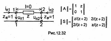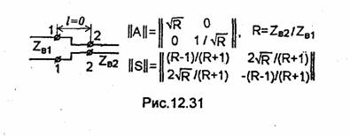 2. Стык двух линий передачи с разными волновыми сопротивлениями -двухплечное устройство (рис.12.31), которое можно представить четырехполюсником. Причем расстояние между плоскостями отсчета в плечах равно 0.