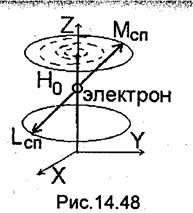 Прецессия магнитного момента. Предположим, что электрон с магнитным моментом Мсп и механическим моментом Lсп помещен во внешнее постоянное магнитное поле Ho=zoHo, направление которого не совпадает с Мсп, (рис. 14.48). Под влиянием внешнего поля магнитный момент стремится повернуться и установиться параллельно Но, причем вращательный момент Т равен {58]: