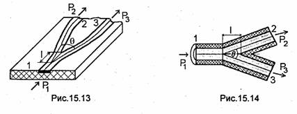 вдоль линии, соединяющей продольные оси световодов в плечах 1 и 3, несколько светоделительных пластин, параллельных друг другу и расположенных на некотором расстоянии одна от другой, можно получить делитель, обеспечивающий деление входного сигнала на несколько частей. В планарной (рис. 15.13) и волоконной (рис. 15.14) конструкциях Т-разветвления световодов неоднородность, образующаяся в месте разветвления, приводит к появлению излучения в окружающее пространство. Для уменьшения этого излучения до пренебрежимо малой величины обычно выбирают малый угол разветвления (Θ≈1...2°) и достаточно большую длину l=3...5 см.
