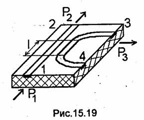 а на рис. 15.19 интегрально-оптическая конструкция ответвителя. Мощность Р1 поданная в плечо 7, делится между выходными плечами 2 и 3, а в плечо 4 мощность практически не ответвляется.