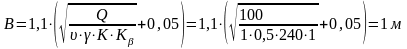 Производительность конвейера Q = 100 т/ч; скорость ленты u = 1 м/с, объемная масса насыпного груза g = 0,5 т/м3; коэффициент, зависящий от угла естественного откоса груза, К = 240; коэффициент, зависящий от угла наклона конвейера, Кb = 1.