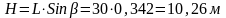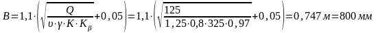 Производительность ленточного конвейера Q = 125 т/ч; скорость ленты u = 1,25 м/с; объемная масса насыпного груза g = 0,8 т/м3; коэффициент, зависящий от угла естественного откоса груза, К = 325; коэффициент, зависящий от угла наклона конвейера, Кb = 0,97. Лента желобчатая с углом наклона боковых роликов 30°.
