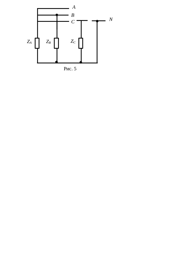 До трифазної лінії з лінійною напругою (рис. 5) підключений симетричний трифазний приймач, з’єднаний за схемою „зірка”. Опори кожної з фаз приймача рівні Zф=Rф+jXф.