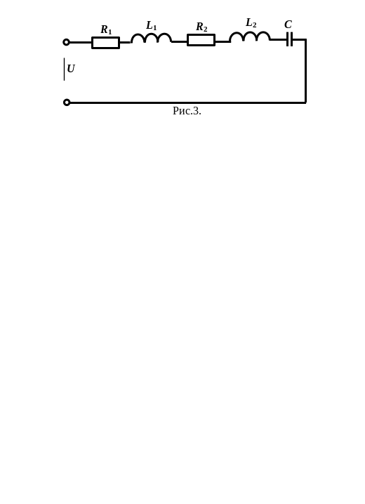 У коло синусоїдного струму з частотою f = 50 Гц (рис. 3) ввім-кнені послідовно дві котушки і конденсатор. Визначити струм, напруги на окремих елементах кола, скласти баланс потужностей, якщо відомі напруга на вході і параметри елементів (табл. 1.3.). Побудувати векторну діаграму.