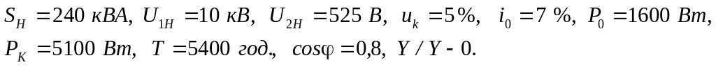Трифазний трансформатор характеризується наступними вели-чинами: номінальна потужність Sном, номінальна максимальна лінійна напруга U1ном, номінальна мінімальна напруга U2ном, процентне значення напруги короткого замикання uк %, процентне значення струму холостого ходу i0 %, потужність втрат холостого ходу P0 (при первинній напрузі, рівній номінальній), потужність втрат короткого замикання Pк (при струмах в обмотках, рівних номінальним), група з’єднання обмоток.