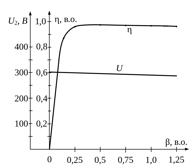 Рис. 26. Залежності U2 = f(β) і η = f(β).