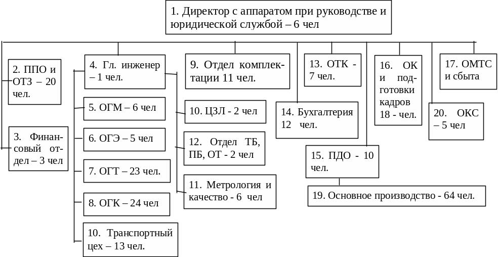 Анализ организационной структуры управления предприятия (рис.1, табл.1) показывает, что директор имеет слишком много подразделений управления – 10 (2,3,4,9,13.14.15.16.17.20), при норме управляемости до 6-ти подразделений. Поэтому часть подразделений требуется переподчинить. Это в свою очередь, относится к отделу комплектации (9), бухгалтерии (14), ОКСу (20). Отделы управления создаются при наличии как минимум 4-х бюро, а каждое бюро должно включать, как минимум, 3-4 чел. Следовательно, отдел должен включить минимально 4 бюро х 3 чел. = 12 чел. В анализируемой организационной структуре таких подразделений всего 5 (№ 7, 8, 14, 15, 18). (Исключая производственно-диспетческий отдел (ПДО), в котором численность обуславливается наличием сменных специализированных диспетчеров и определяется другими методами.) Поэтому численность подразделений управления необходимо пересмотреть. Подразделения с меньшей против норматива численностью необходимо укрупнить, сократив их начальствующий состав, а подразделения с большей против норматива численностью следует проанализировать по выполняемым функциям и скорректировать до необходимых размеров, соответственно укомплектовав их компьютерами.