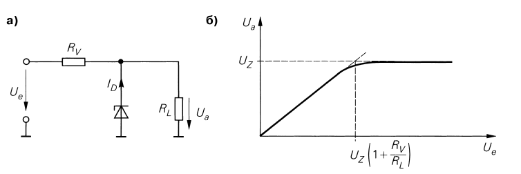 Рис. 1. 4. Стабилизация напряжения с помощью стабилитрона: а – схема; б – вольтамперная характеристика