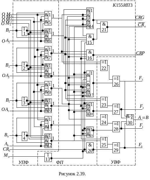Более детально ознакомиться с АЛУ можно на примере микросхемы К155ИПЗ (564ИПЗ). Ее условное графическое обозначение и функциональная схема изображены соответственно на рис. 2.38 и 2.39.