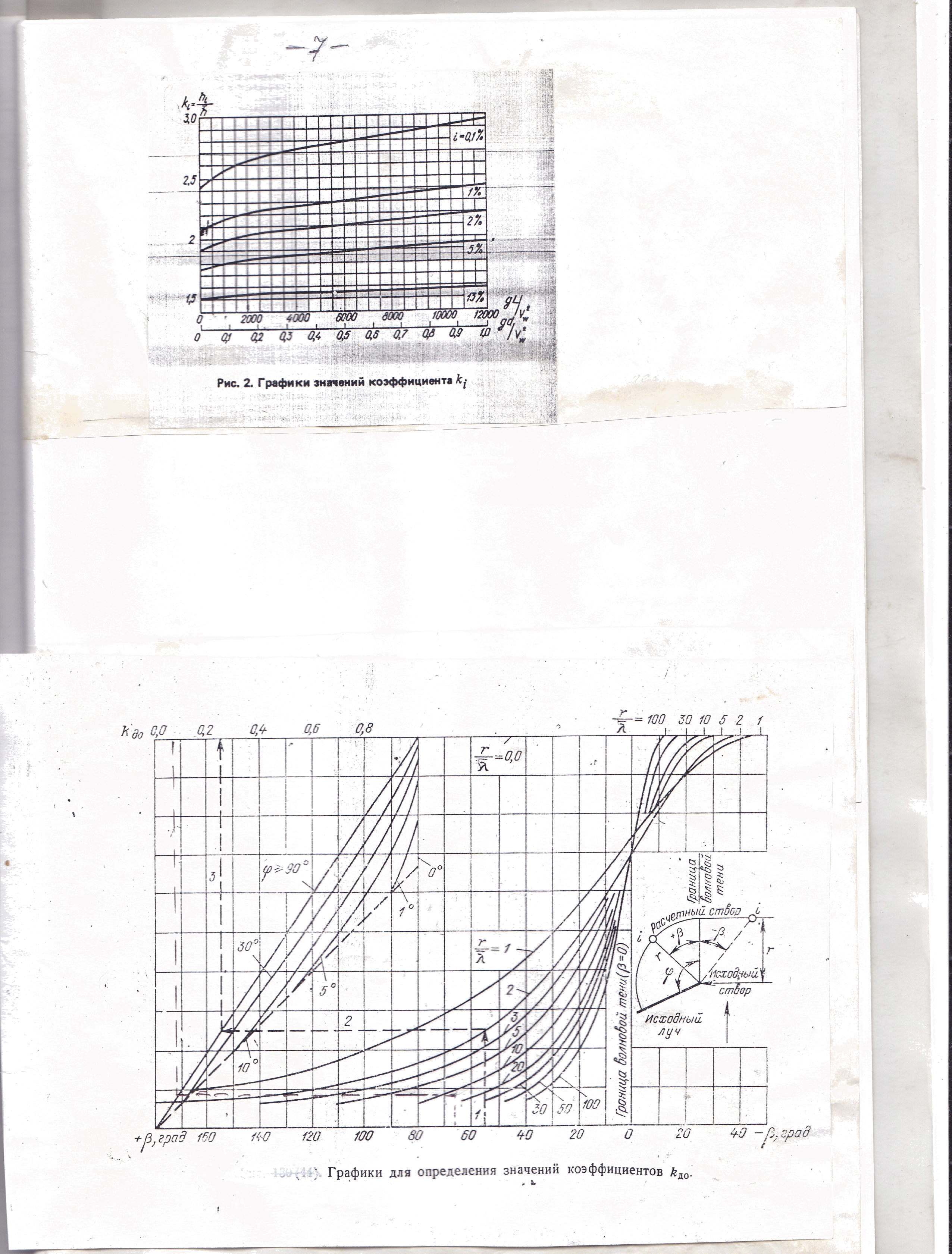 Верхняя огибающая кривая (рис 1) – для глубокой воды с глуби-нами более 0,5 длины волны, что маловероятный случай для курсового проекта. Поэтому определяем параметр gd/Vw2 (правая вертикальная шка-ла на рис 1), где d – естественная глубина воды у входа в порт. Например, глубина у входа в порт d = 11 м. Тогда gd/Vw2 = 9,8 * 11 / 15,62 = 0,44. Поэтому приближенно принимаем кривую, заканчивающуюся у правой вертикальной шкалы на 0,4. От gL/Vw2 =13000 идем вверх до кривой 0,4 и влево до шкал gh/ Vw2 и gT/Vw. Получается в данном случае: gh /Vw2 = 0,045, откуда средняя высота волны h=1,1 м ( с округлением до десятых ). gT/Vw = 2,7 , откуда средний период волн Т = 4,3с