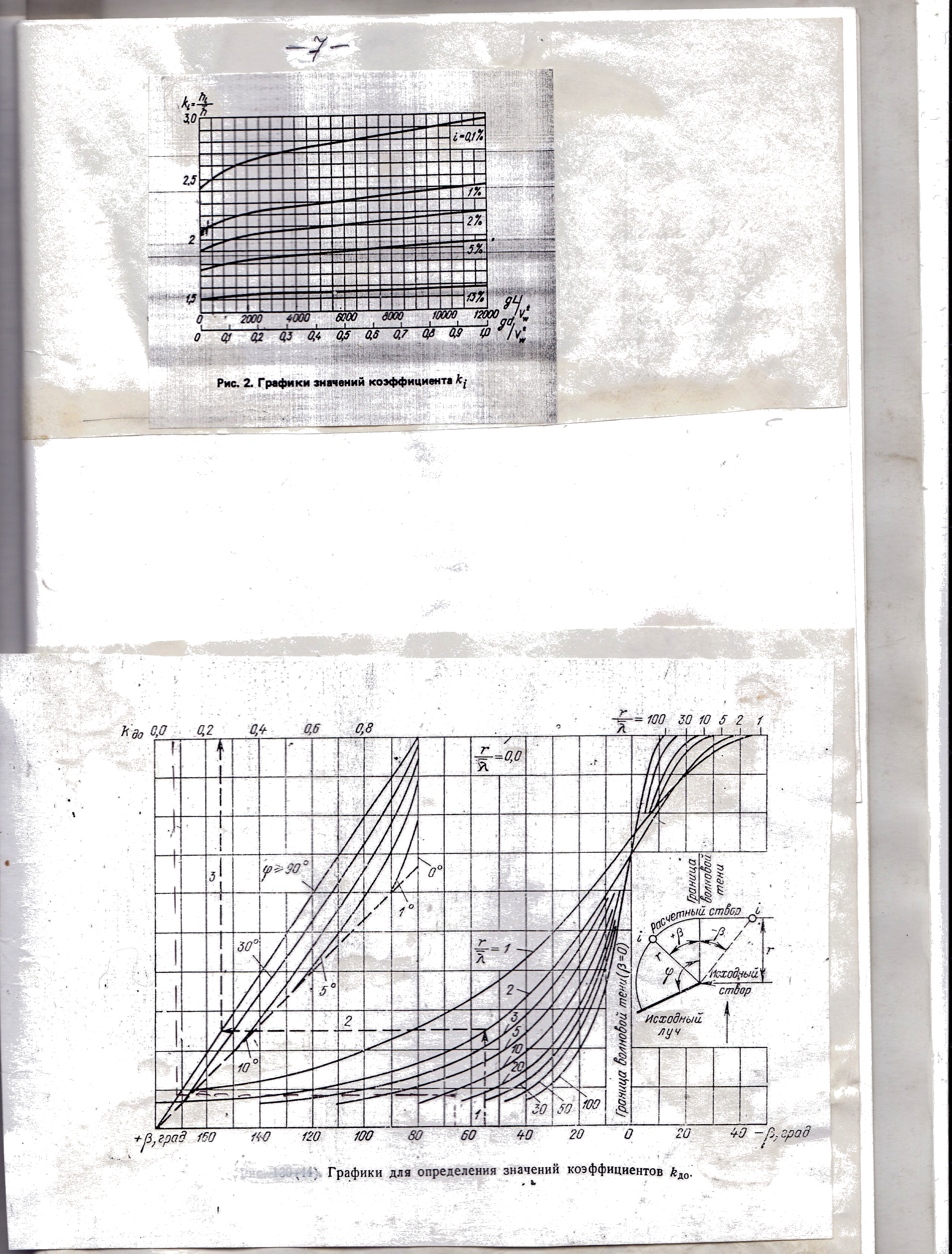 Определяем углы а, б ,в между ГВТ одного из молов и лучами из головы мола на точки а, б и в. Углы отрицательные, так как отсчет идет от ГВТ в сторону ГДВ (рис.4-б). По графикам на рис. 3 (для одиночных молов) при найденных в табл.3 r2/ , углу 2 и углам а, б , в определяем коэффициенты дифракции К дг для точек а, б, в на главном луче. Углы точек 1, 2, 3 ( 1, 2, 3) положительные, так как отсчет ведется от ГВТ в сторону зоны волновой тени. По графикам на рис. 3 определяем коэффициенты дифракции Кдо для точек 1 и 2 при значениях r2/, 2, 1, 2 , а для точки 3 - по r1/, 1 и 3.