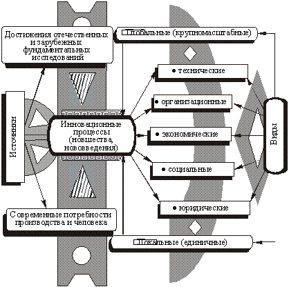 Результатом инновационных процессов являются новшества, а внедрение их в хозяйственную практику принято называть нововведениями. Инновационные процессы инициируются отдельными отраслями науки, а завершаются в сфере производства, способствуя прогрессивным изменениям последнего. Первичными импульсами внедрения новшеств (нововведений) на предприятиях являются не только общественные потребности и результаты фундаментальных научных исследований, но и использование зарубежного прогрессивного опыта в сферах технологии и организации производства, современных форм хозяйствования. По своему характеру инновационные процессы, новшества и нововведения делятся на взаимосвязанные виды (рис. 9.1).