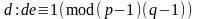 -Вычисляется число d, мультипликативно обратное к числу e по модулю -