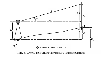 Для определения превышений и отметок тригонометрическим нивелированием (рис. 8) в точке планово-высотного обоснования устанавливают теодолит, а на пикет устанавливают рейку.