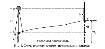 Существует частный случай тахеометрической съемки, который применяют для равнинной местности (обычно для застроенной территории). При этом превышения на пикеты определяют горизонтальным лучом визирования, способом «вперед» (рис. 9). Визирную ось теодолита устанавливают в горизонтальное положение при помощи цилиндрического уровня на зрительной трубе.