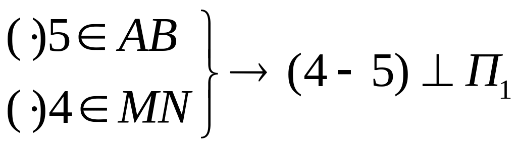 Рассмотрим две скрещивающиеся прямые MN и AB.Проведем горизонтально-проецирующую прямую (4–5), которая пересекает прямую МN в точке 4, а сторону АВ в точке 5. Координаты точек по Z разные – Z5>Z4, следовательно, точка 5 стороны АВ наиболее удалена от плоскости проекции П1 и будет видимой на П1, поэтому сторона АВ на П1 – видимая.