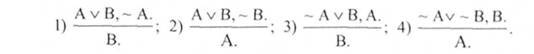 А. В - з істинного судження логічно слідує диз'юнкція його з будь-яким А V В, А V В та іншим судженням. Якщо істинність деякого твердження є доведеною, то можна утворити нове твердження-аргумент - диз'юнкцію даного з будь-яким іншим, оскільки диз'юнкція буде істинною при істинності принаймні одного з них - А або В.
