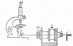 Схематическое изображение флуоресцентного микроскопа: 1. Дуговая лампа; 2. Кварцевый коллектор; 3. Кювета, заполненная раствором сернокислой меди; 4. Передняя часть коллектора; 5. Ультрафиолетовый фильтр; 6. Призма; 7. Пластинка из уранового стекла; 8. Окулярный фильтр, поглощающий ультрафиолетовые лучи