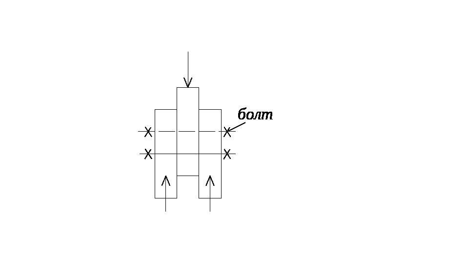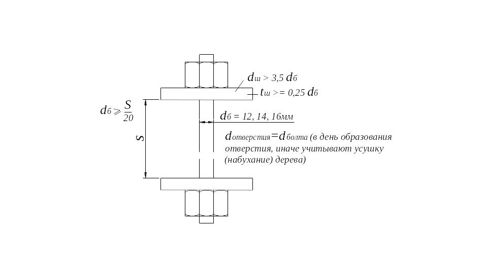 Древесина у болтов разрушается хрупко от раскалывания вдоль волокон. Для прямоугольного леса болты не менее 2 рядов, для крупного – в 1 ряд.
