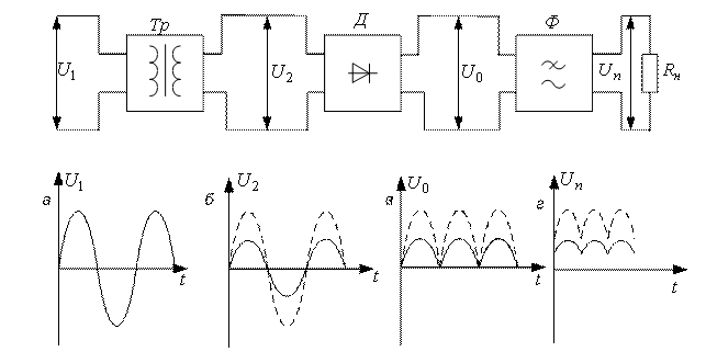 Рис. 1.1. Схема выпрямительного устройства: а – диаграмма на входе трансформатора;