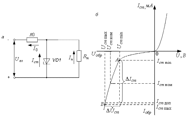 Рис. 2.2. Параметрический стабилизатор напряжения: а – принципиальная схема стабилизатора, б – вольт–амперная характеристика стабилитрона