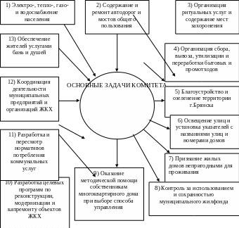 На Комитет по ЖКХ Брянской городской администрации возложено множество задач, основные из них перечислены на рисунке 12. Комитет организует снабжение населения города топливом, содержание и ремонт автомобильных дорог общего пользования, мостов и иных искусственных инженерных сооружений, за исключением автомобильных дорог общего пользования, мостов и иных транспортных и инженерных сооружений федерального и регионального значения, осуществляет контроль за использованием и сохранностью муниципального жилищного фонда, соответствием жилых помещений данного фонда установленным санитарным и техническим правилам и нормам и ещё ряд задач.