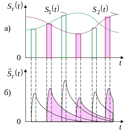 При часовому розподілі взаємні завади обумовлені двома причинами. Перша полягає в тому, що лінійні спотворення, що виникають за рахунок обмеження смуги частот і неідеальності АЧХ і ФЧХ усякої фізично здійснюваної системи зв'язку, порушують форму імпульсів сигналів. Дійсно, якщо при передачі модульованих імпульсів кінцевої тривалості обмежити спектр, то імпульси «розпливуться» і замість імпульсів кінцевої тривалості одержуємо процеси, нескінченно протяжні в часі. При РКЧ це приведе до того, що імпульси одного каналу будуть накладатися на імпульси інших каналів (рис. 9.7). Інакше кажучи, між каналами виникають взаємні перехідні завади. Можливі такі завади і через порушення синхронізації.