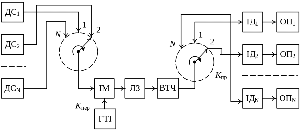 Рисунок 9.5 – Структурна схема багатоканальної системи передачі повідомлень із часовим розподілом каналів