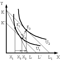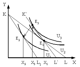 Определим, каким должен был бы быть денежный доход потребителя, чтобы при изменившемся соотношении цен обеспечить ему прежний уровень удовлетворения. Для этого проведем вспомогательную бюджетную прямую K'L', параллельную линии KL1 (т.е. отражающую новое соотношение цен), так, чтобы она касалась кривой безразличия U1 (т.е. обеспечивала бы прежний уровень удовлетворения). Отметим точку касания Е3 и соответствующий объем потребления товара X3.