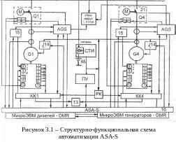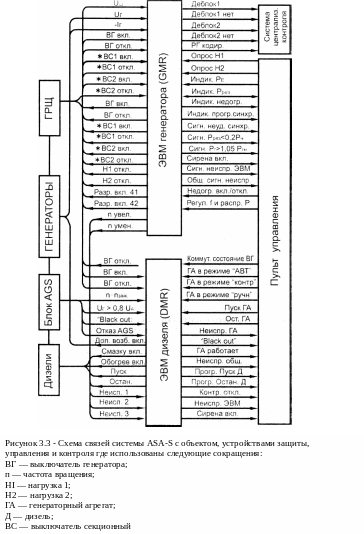 Схема связей ASA-S с дизелями, генераторами, блоками защиты агрегатов AGS, главным распределительным щитом ГРЩ, пультом управления и системой централизованного контроля показана на рис. 3.3.