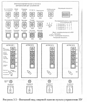 На пульте ПУ расположены четыре панели управления и сигнализации генераторными агрегатами. На панели управления генераторным агрегатом расположены: