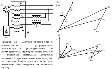 В случае увеличения тока нагрузки СГ без изменения фазы (см. рис. 1.8, б) (φ = соnst) напряжение генератора может уменьшиться, однако вместе с током нагрузки увеличится магнитный поток обмоток тока до значения Ф'т. Соответственно увеличится магнитный поток суммирующих обмоток Фс до значения Ф'с. Ток возбуждения СГ возрастет, и напряжение восстановится до номинального значения. Таким образом, в СГ токовые обмотки wт выполняют ту же роль, что последовательная обмотка возбуждения в генераторах постоянного тока смешанного возбуждения, а именно: компенсировать своим магнитным потоком потерю напряжения вследствие увеличения нагрузки. Напомним, что именно благодаря наличию последовательной обмотки возбуждения генераторы постоянного тока смешанного возбуждения не нуждаются в автоматических регуляторах напряжения и поэтому применяются в качестве основных генераторов, предназначенных для производства электроэнергии.