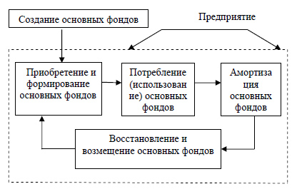 На схеме стадии воспроизводства основных фондов разделены на две части. Одна часть — это создание основных фондов, что чаще всего происходит вне предприятия. Создание основных фондов в соответствии с их структурой происходит в двух сферах: в строительной индустрии и машиностроении, том числе и в приборостроении. Вторая часть — это стадии, которые осуществляются внутри предприятия.