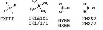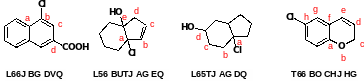 Бициклические соединения записывают начиная с буквы L или T, в зависимости от того входит в состав конденсированного соединения гетероцикл или нет, следующие две цифры обозначают размер сочлененных циклов и окончания цикла J, положения замещения начинают нумеровать с атома сочленения так, чтобы заместители имели наименьшую букву.