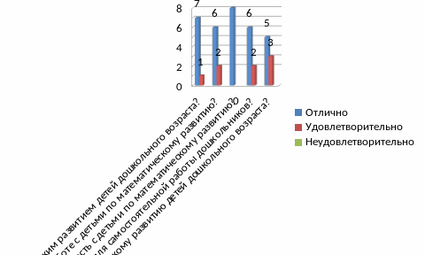 Таким образом, в результате анкетирвоания, видно, что организация работы по математическому развитию детей дошкольного возраста в ДОУ поставлена неудовлетворительно. То же самое можно сказать и об организации взаимодействия ДОУ и родителей. Кроме того, родители также не занимаются математическим развитием своих детей.