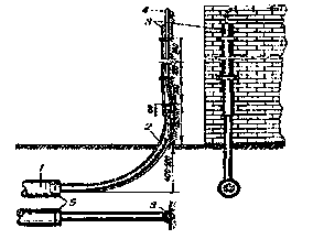 7.2.14 В том случае, когда ввод кабеля предусмотрен на наружную стену здания и отсутствуют полиэтиленовые трубы, кабель следует вводить при помощи изогнутой стальной трубы, сопряженной с трубопроводом, проложенным от кабельной канализации (рисунок 7.10).