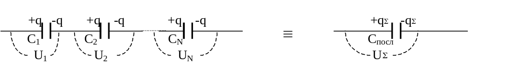 При последовательном соединении конденсаторов (в цепочку, один за другим) одинаковым является заряд q = q = q на каждом из конденсаторов, а результирующая разность потенциалов равна сумме = U разностей потенциалов на каждом из конденсаторов1. И результирующая емкость батареи из N последовательного соединенных конденсаторов будет равна: