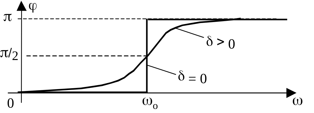 Анализ фазочастотной характеристики показывает, что вынужденные колебания всегда отстают по фазе от вынуждающей силы (следствие всегда запаздывает от причины). Это отставание-запаздывание увеличивается с ростом затухания в колебательной системе. При нулевом затухании ( = 0) угол отставания по фазе вынужденных колебаний заряда от внешней ЭДС скачком изменяется на (от 0 до 180) при = о, то есть на частоте собственных колебаний системы (контура).