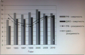 Коэффициент смертности может приобрести тенденцию к увеличению из-за постарения населения. Так, в 2010 г. он уже поднялся до 13,5‰ в целом по округу и еще выше он оказался в отдельных субъектах: в Приморском крае - 14,2‰, Хабаровском – 14,0‰, в Амурской, Еврейской автономной областях и на Чукотке его значение составило 14,8‰
