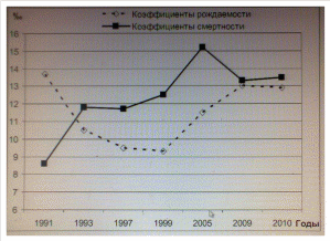 Рис. 2. Коэффициенты рождаемости и смертности в 1991 – 2010 гг.