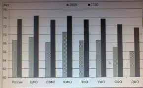 Рожденные на Дальнем Востоке в 2009 г. имеют шанс дожить только до 65,86 лет, в России - до 68,67. Средняя продолжительность жизни дальневосточников за период 1993 - 2009 гг. увеличилась на 3 года, в России - на 3,6 года. Правда, к 2030 г. предполагается сократить разницу в продолжительности жизни и достичь 73,3 лет в РФ и 72,4 – на Дальнем Востоке. Средний возраст населения в России -38,9 года, на Дальнем Востоке - 36,7 лет (Демографический ежегодник Российской Федерации. 1993. / Госкомстат России. М., 1994 г. С. 84, 92; Демографический ежегодник России. 2010: Стат. сб. / Росстат. – М., 2010. С. 61,63, 102, 107; Предположительная численность населения Российской Федерации до 2-10 года. Стат. бюлл. ФСГС. М., 2009. С. 210, 212). В Москве средняя продолжительность жизни в 2009 г. составила 72 года, по данным столичного департамента здравоохранения. Это – лучший показатель по стране (Газета «Метро. Москва», 2009) (рис. 8).