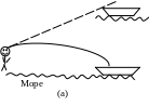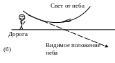 Мираж. Летом температура воздуха над поверхностью моря ниже, чем в более удаленных от его поверхности точках; другими словами, температура воздуха по мере удаления от поверхности моря увеличивается. Нагревание воздуха приводит к его расширению, а расширение, в свою очередь, — к уменьшению показателя преломления. Так как свет в теплых слоях проходит быстрее, чем в холодных, то в результате этого он распространяется по кривой траектории с наименьшим временем. Вот почему путь светового луча от некоторого плавающего летом в море предмета, например, лодки, искривляется и поэтому лодку мы видим как бы висящей в воздухе (рис. 13 а). По этой же причине летом, когда температура воздуха по мере удаления от поверхности земли уменьшается, на шоссейной дороге мы видим «воду» (в действительности — голубое небо), которое исчезает при приближении к данному месту (рис. 13 б).