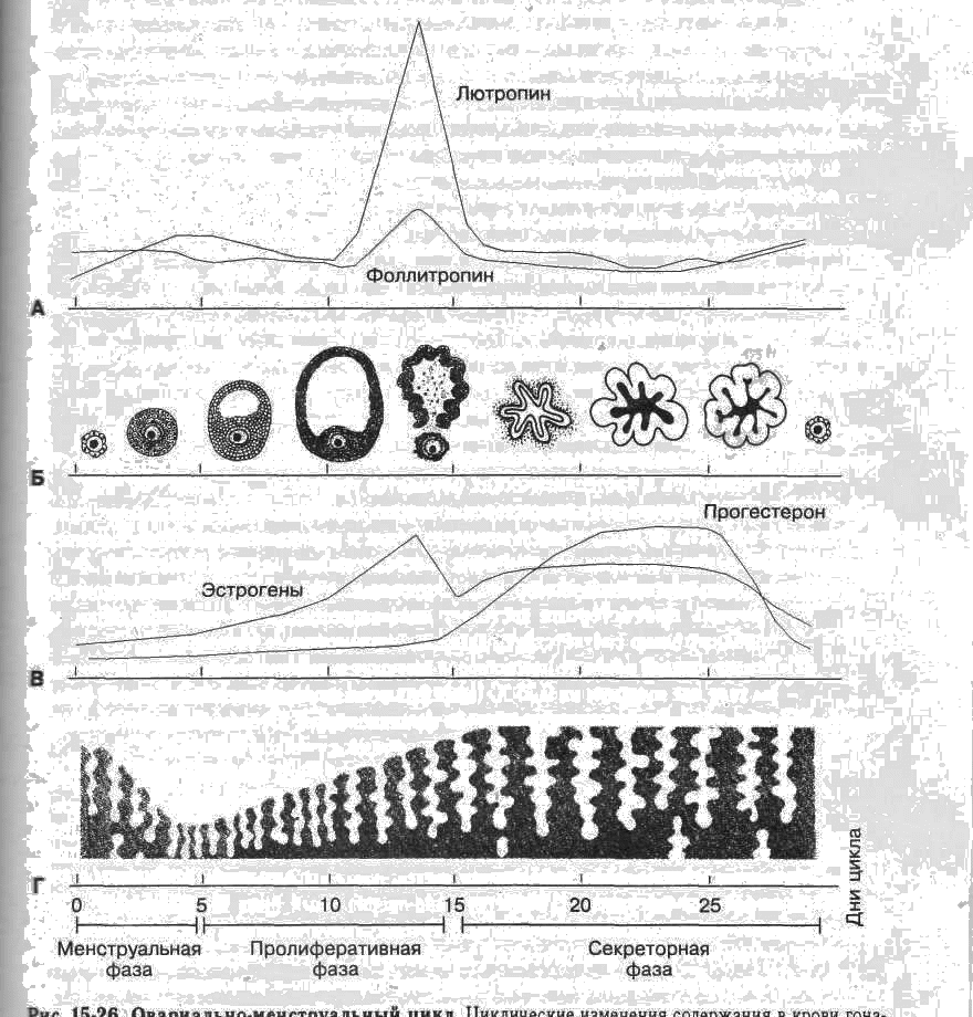 Циклические изменения содержания в крови гонадотропных гормонов регулируют созревание очередного фолликула и овуляцию (А и Б). По мере развития фолликула в крови повышается уровень эстрогенов, а с момента овуляции и образования жёлтого тела увеличивается концентрация прогестерона (Б и В). Эстрогены и прогестерон вызывают характерные изменения в эндометрии матки в зависимости от стадии цикла (В и Г).