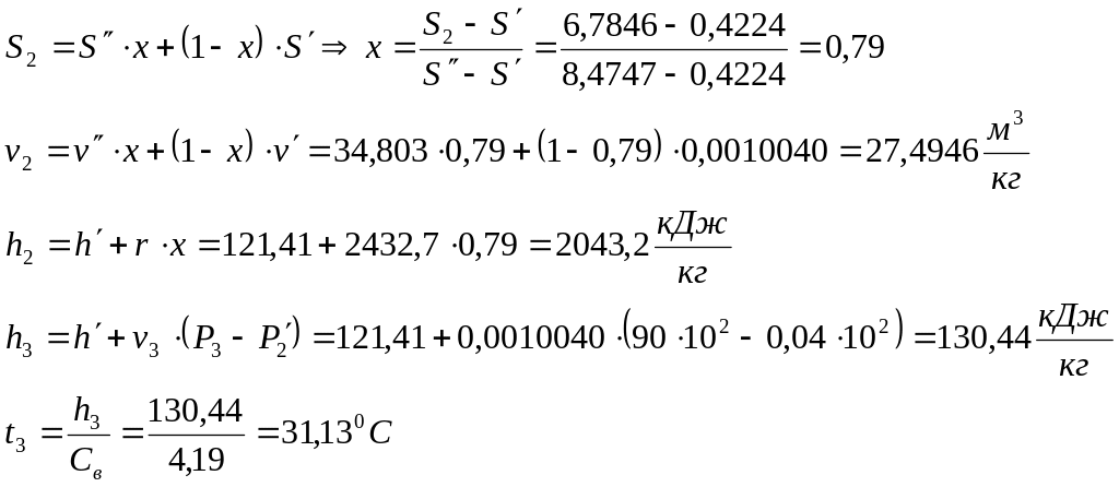 q1= h1-h3=3485,9-130,44=3355,46кДж/кг q2= h2-h2’=2043,2-121,41=1921,79 кДж/кг