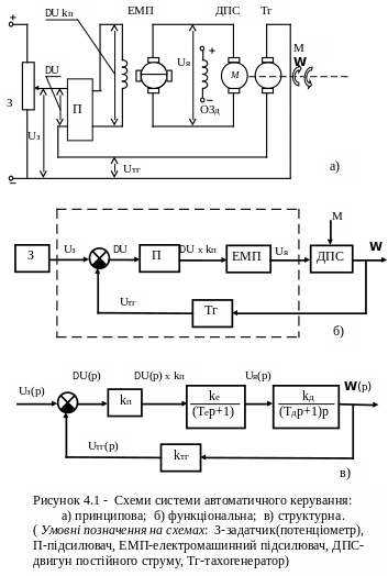 Структуру системи автоматичного керування одержують із розгляду принципової схеми шляхом переходу до еквівалентної функціональної схеми. Як приклад на рисунку 4.1 показані принципова, функціональна і структурна схеми системи автоматичного керування частотою обертання двигуна постійного струму головного приводу верстата з числовим програмним керуванням (ЧПК). Принцип побудови і опис роботи цієї системи викладається в лекційному курсі. Після проведення певної ідеалізації системи і знаходження математичного опису кожного елемента у вигляді динамічної ланки, отримують структурну схему системи автоматичного керування, яка також показана на рисунку 4.1. Маючи числові значення всіх постійних коефіциєнтів, можна провести аналіз системи з метою оцінки роботоздатності системи шляхом визначення стійкості і параметрів якості по різноманітних характеристиках. Методика такого аналізу наводиться в наступних розділах і частково в [1-3].