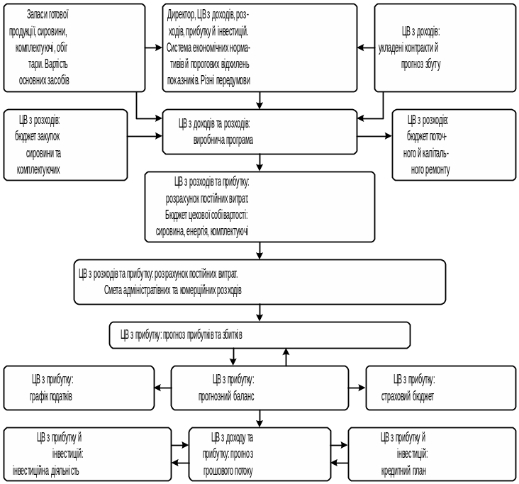 Рекомендована структура зведеного бюджету, що узагальнює роботи з фінансового планування та пов’язана з центрами відповідальності (ЦВ) наведена на рис. 9.5.