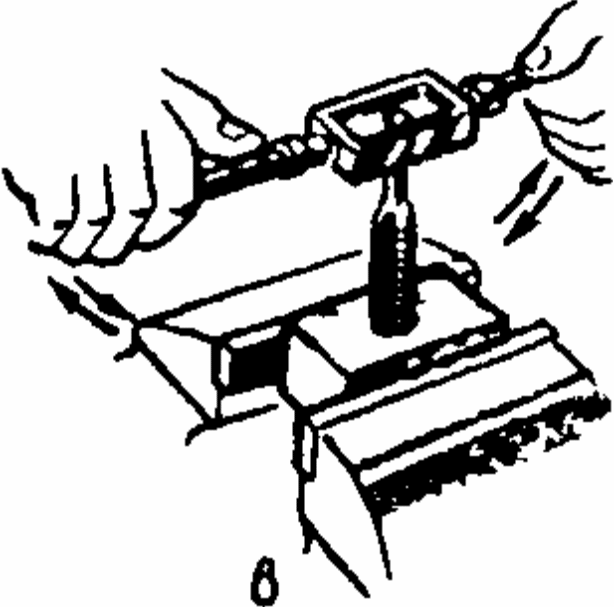 Нарізування внутрішньої різьби. Користуючись формулою (2.1) підбирають свердло потрібного діаметру і просвердлюють у заготівці отвір. Потім підбирають необхідні мітчики (рис. 47, 48) і закріплюють заготівку в лещатах. Змащують робочу поверхню першого (чорнового) мітчика олією і вставляють його забірною частиною в отвір заготівки. Надягають на хвостовик мітчика вороток (рис.49) і, натискаючи правою рукою на мітчик униз, лівою обертають вороток за годинною стрілкою до врізання мітчика в метал на кілька ниток (рис.50). Нарізають різьбу, обертаючи мітчик за рукоятку воротка за годинною стрілкою на один-два оборота і на пів-обороту назад до повного входу робочої частини мітчика в отвір (рис.51).
